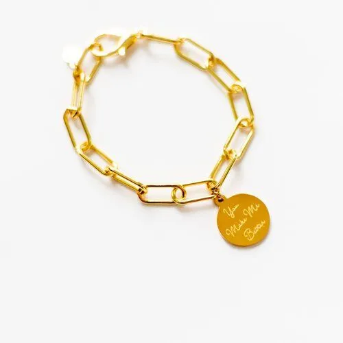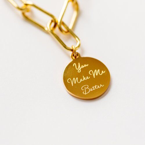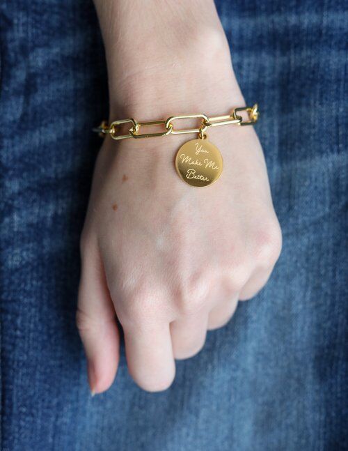 The Gold You Make Me Better Pendant Bracelet has a 24K gold electroplated stainless steel pendant with gold PVD plated stainless steel chain which measures 7.5” in length x .25” in width. The chain links allow for adjustable sizing if you would like to make it fit snugger.