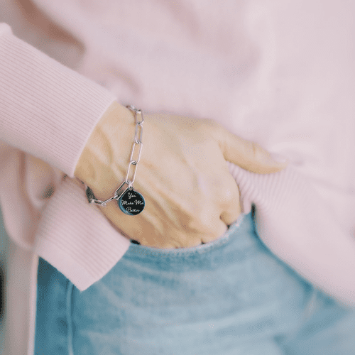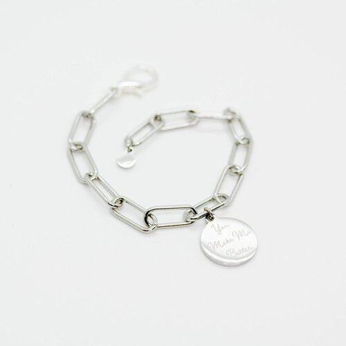 The ‘You ‘Make Me Better’ Pendant Bracelet is made of Stainless Steel and measures 7.5” length x .25” width. The chain links allow for adjustable sizing if you would like to make it fit more snug.